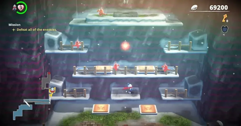 - Freeze enemies and roll them into snowballs to defeat foes